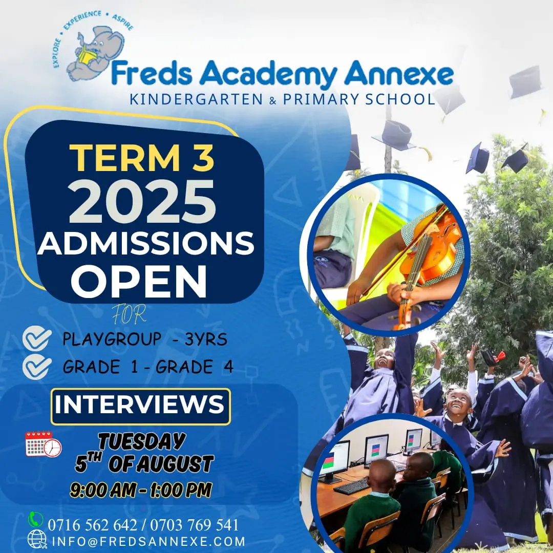 Freds Academy Annexe is a state of art school offering quality education and holistic development to children. We are located at the heart of Meru County and cater for kindergarten and primary (Grade 1-6).